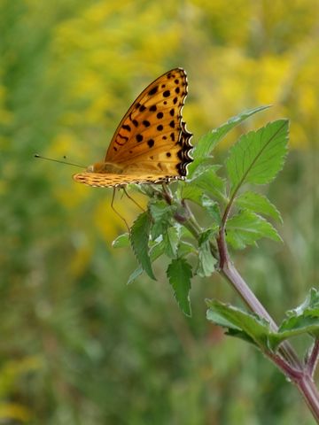 タテハチョウの仲間、ツマグロヒョウモンです。正面に回って写真を撮ろうと思ったら逃げられてしまいました。 |
