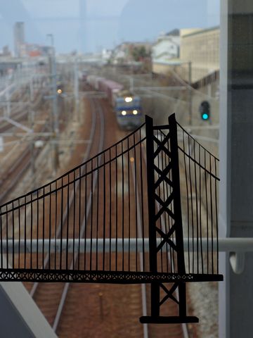 JR朝霧駅、通路の窓ガラスに明石海峡大橋の切り絵?が貼り付けられています。